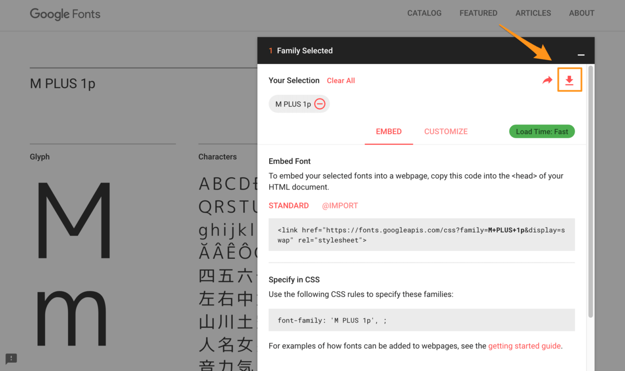 フォントはどこから入手しても構いませんが、GoogleFontsでダウンロードしてみます。以下、M PLUS 1pのページです。